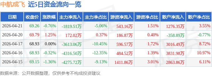 证券之星消息,截至2026年4月21日收盘,中航成飞(302132)报收于69.26元,下跌0.76%,换手率0.88%,成交量5.18万手,成交额3.6亿元。