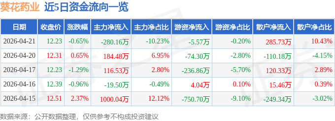 证券之星消息,截至2026年4月21日收盘,葵花药业(002737)报收于12.23元,下跌0.65%,换手率0.38%,成交量2.23万手,成交额2739.49万元。