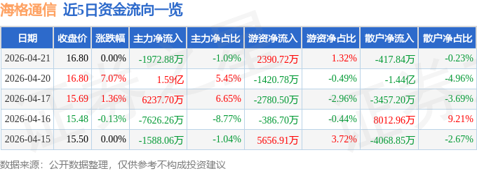 证券之星消息,截至2026年4月21日收盘,海格通信(002465)报收于16.8元,上涨0.0%,换手率4.35%,成交量107.71万手,成交额18.06亿元。