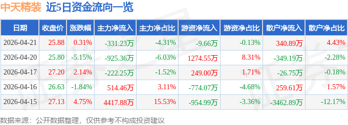 证券之星消息,截至2026年4月21日收盘,中天精装(002989)报收于25.88元,上涨0.31%,换手率1.64%,成交量3.01万手,成交额7686.59万元。