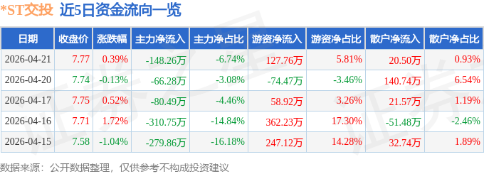 证券之星消息,截至2026年4月21日收盘,*ST交投(002200)报收于7.77元,上涨0.39%,换手率1.47%,成交量2.88万手,成交额2200.86万元。