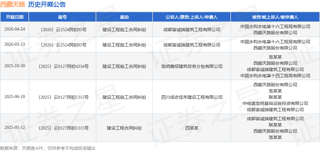 根据统计,近一年内以西藏天路股份有限公司为当事人的历史开庭公告有5则,其中案由为“建设工程施工合同纠纷”的公告以4则居首,其次为“建设工程合同纠纷”有1则。历史开庭公告如下: