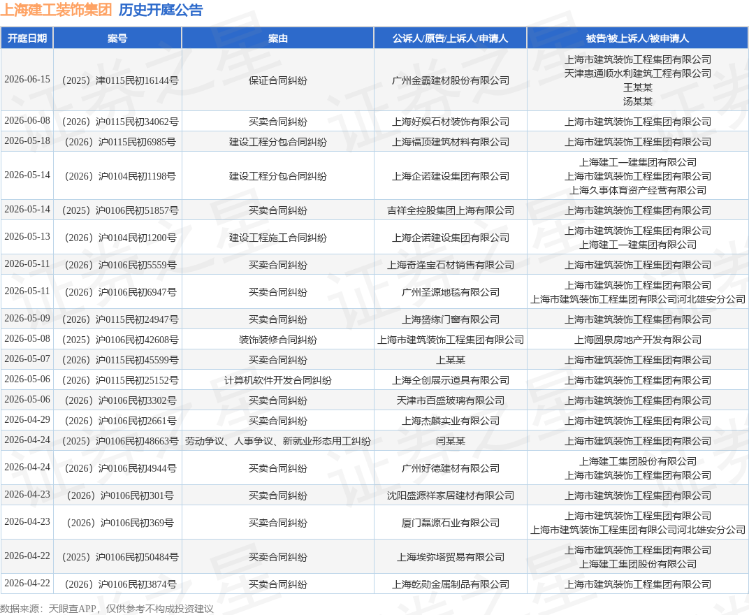 案号:(2026)沪0106民初4944号根据统计,近一年内以上海市建筑装饰工程集团有限公司为当事人的历史开庭公告有443则,其中案由为“买卖合同纠纷”的公告以206则居首,其次为“建设工程施工合同纠纷”有42则,“装饰装修合同纠纷”有42则。历史开庭公告(前20条)如下: