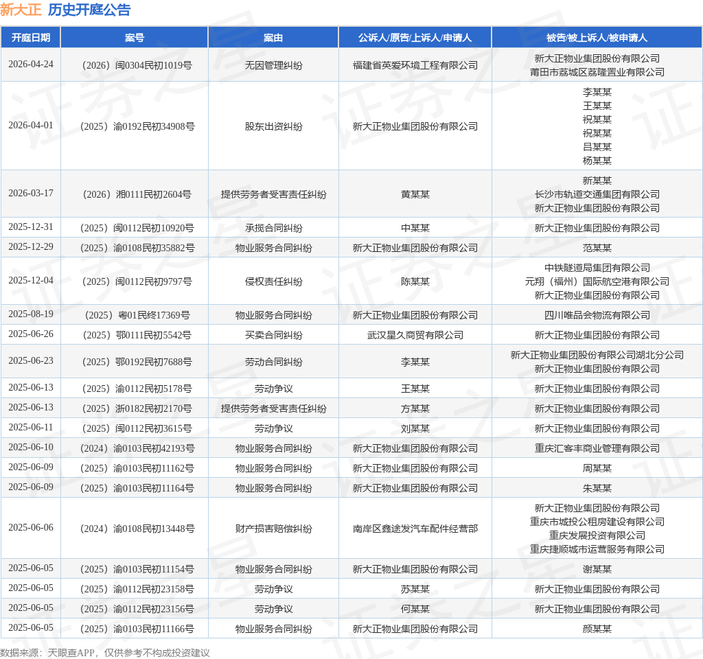 案号:(2026)闽0304民初1019号根据统计,近一年内以新大正物业集团股份有限公司为当事人的历史开庭公告有34则,其中案由为“物业服务合同纠纷”的公告以14则居首,其次为“劳动争议”有8则,“侵权责任纠纷”有2则。历史开庭公告(前20条)如下: