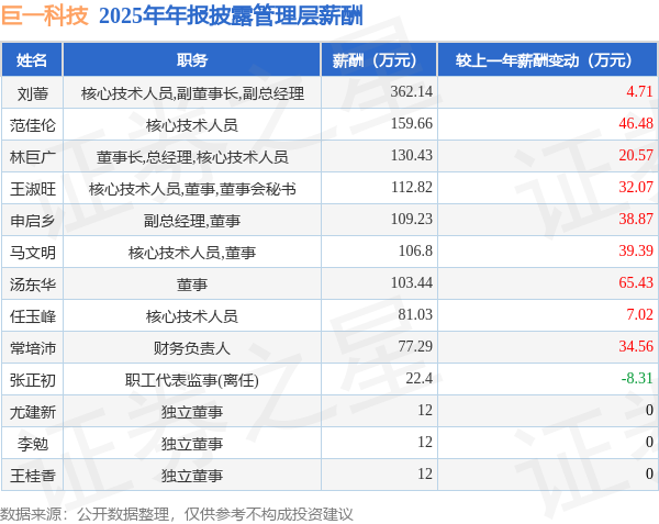 证券之星消息,巨一科技发布2025年年报,数据显示:公司主营收入43.35亿元,同比增23.04%。归母净利润为8096.0万元,同比增279.77%。扣非净利润为5309.37万元,同比增471.96%。当年公司员工总数2937人,同比增3.63%。人均薪酬20.77万元(注:"人均薪酬"根据定期报告中"应付职工薪酬"附注的本期增加值 / 员工总数计算而来),同比减3.69%。人均创收147.61万元,同比增18.73%。人均创利2.73万元,同比增259.58%。其中管理层薪酬总额为1301.24万元,同比上一年增25.76%,薪酬最高的为核心技术人员,副董事长,副总经理刘蕾,薪酬362.14万元。