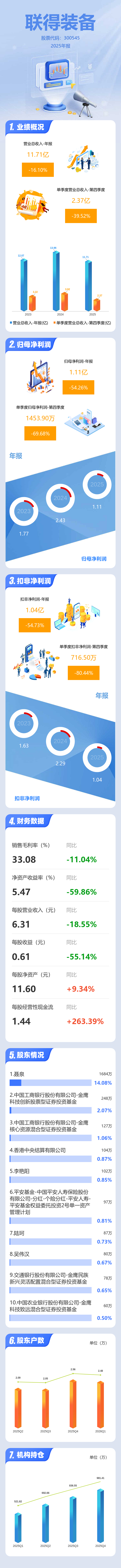 证券之星消息,联得装备2025年年报显示,当年度公司主营收入11.71亿元,同比下降16.11%;归母净利润1.11亿元,同比下降54.26%;扣非净利润1.04亿元,同比下降54.73%;其中2025年第四季度,公司单季度主营收入2.37亿元,同比下降39.53%;单季度归母净利润1453.9万元,同比下降69.69%;单季度扣非净利润716.5万元,同比下降80.44%;负债率27.52%,投资收益-25.65万元,财务费用898.29万元,毛利率33.08%。