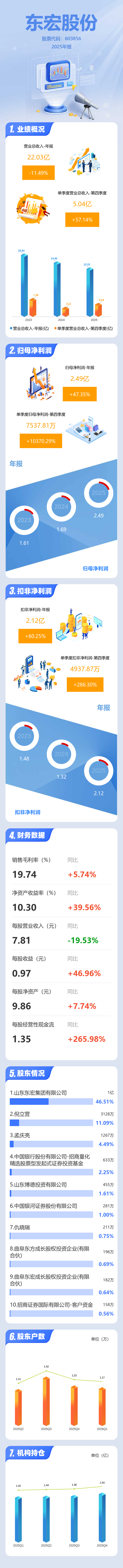 证券之星消息,东宏股份2025年年报显示,当年度公司主营收入22.03亿元,同比下降11.49%;归母净利润2.49亿元,同比上升47.35%;扣非净利润2.12亿元,同比上升60.26%;其中2025年第四季度,公司单季度主营收入5.04亿元,同比上升57.14%;单季度归母净利润7537.81万元,同比上升10370.29%;单季度扣非净利润4937.87万元,同比上升286.31%;负债率30.13%,投资收益1227.93万元,财务费用687.76万元,毛利率19.74%。