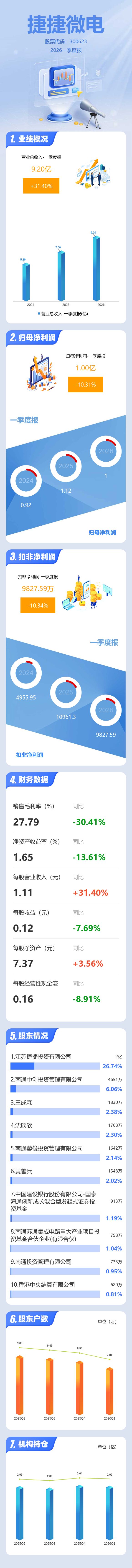 证券之星消息,捷捷微电2026年一季报显示,一季度公司主营收入9.2亿元,同比上升31.41%;归母净利润1.0亿元,同比下降10.32%;扣非净利润9827.59万元,同比下降10.34%;负债率26.87%,财务费用562.62万元,毛利率27.79%。