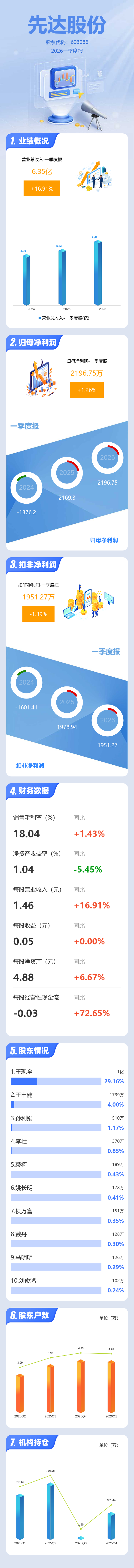 证券之星消息,先达股份2026年一季报显示,一季度公司主营收入6.35亿元,同比上升16.91%;归母净利润2196.75万元,同比上升1.27%;扣非净利润1951.27万元,同比下降1.4%;负债率49.41%,投资收益-6.97万元,财务费用1117.4万元,毛利率18.04%。