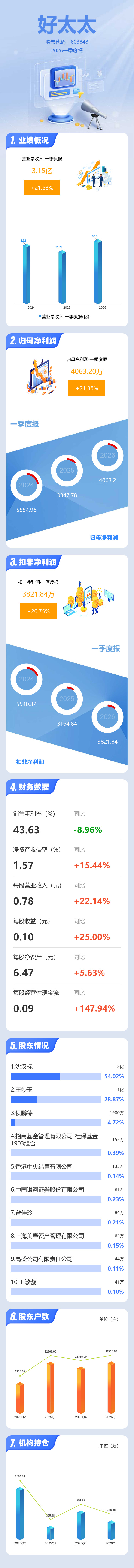 证券之星消息,好太太2026年一季报显示,一季度公司主营收入3.15亿元,同比上升21.68%;归母净利润4063.2万元,同比上升21.37%;扣非净利润3821.84万元,同比上升20.76%;负债率15.27%,投资收益-36.01万元,财务费用-182.53万元,毛利率43.63%。