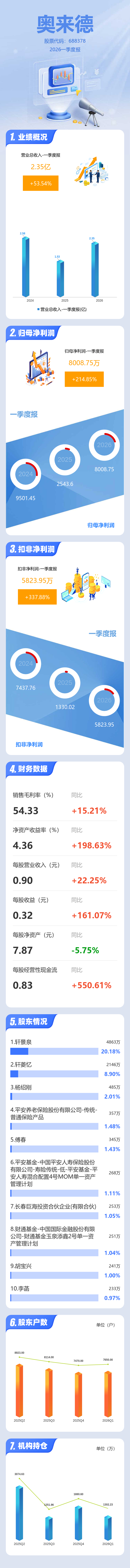 证券之星消息,奥来德2026年一季报显示,一季度公司主营收入2.35亿元,同比上升53.55%;归母净利润8008.75万元,同比上升214.86%;扣非净利润5823.95万元,同比上升337.88%;负债率25.45%,投资收益291.76万元,财务费用-32.67万元,毛利率54.33%。