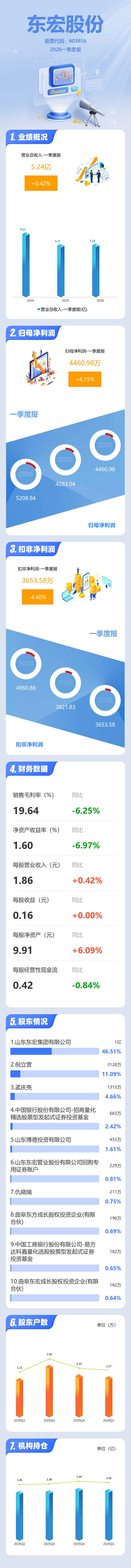 证券之星消息,东宏股份2026年一季报显示,一季度公司主营收入5.24亿元,同比上升0.43%;归母净利润4460.98万元,同比上升4.15%;扣非净利润3653.58万元,同比下降4.4%;负债率27.51%,投资收益-46.1万元,财务费用85.21万元,毛利率19.64%。