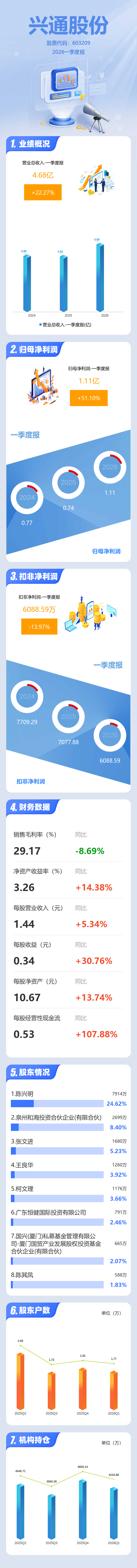 证券之星消息,兴通股份2026年一季报显示,一季度公司主营收入4.68亿元,同比上升22.28%;归母净利润1.11亿元,同比上升51.11%;扣非净利润6088.59万元,同比下降13.98%;负债率36.6%,投资收益477.75万元,财务费用2122.69万元,毛利率29.17%。