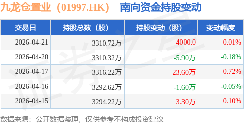 证券之星消息,4月21日南向资金增持4000.0股九龙仓置业(01997.HK)。近5个交易日中,获南向资金增持的有3天,累计净增持19.8万股。近20个交易日中,获南向资金增持的有10天,累计净增持54.8万股。截至目前,南向资金持有九龙仓置业(01997.HK)3310.72万股,占公司已发行普通股的1.08%。