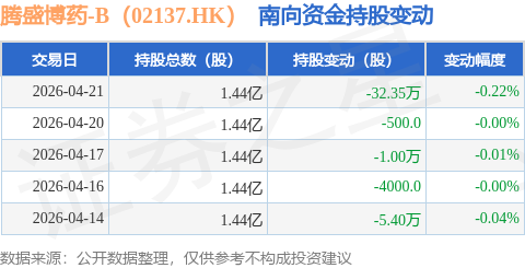 证券之星消息,4月21日南向资金减持32.35万股腾盛博药-B(02137.HK)。近5个交易日中,获南向资金减持的有5天,累计净减持39.2万股。近20个交易日中,获南向资金减持的有20天,累计净减持111.45万股。截至目前,南向资金持有腾盛博药-B(02137.HK)1.44亿股,占公司已发行普通股的19.59%。
