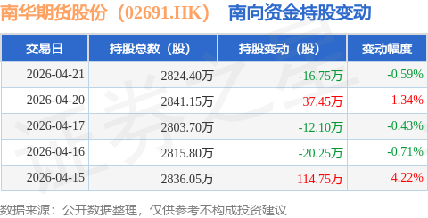证券之星消息,4月21日南向资金减持16.75万股南华期货股份(02691.HK)。近5个交易日中,获南向资金增持的有2天,累计净增持103.1万股。近20个交易日中,获南向资金减持的有15天,累计净减持19.35万股。截至目前,南向资金持有南华期货股份(02691.HK)2824.4万股,占公司已发行普通股的26.22%。