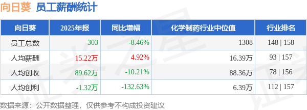 证券之星消息,4月22日向日葵公布2025年年报,当年营收2.72亿元,同比减17.81%;净利润为-438.48万元,同比减156.02%。根据财报数据披露,当年公司员工总数303人,同比减8.46%;人均薪酬15.22万元,同比增4.92%;人均创收89.62万元,同比减10.21%;公司员工薪酬统计见下表: