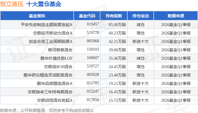持有恒立液压最多的基金为平安先进制造主题股票发起A,目前规模为6.03亿元,最新净值1.7633(4月21日),较上一交易日下跌0.5%,近一年上涨18.16%。该基金现任基金经理为张荫先。