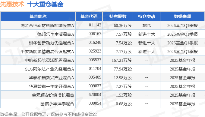 持有先惠技术最多的基金为创金合信新材料新能源股票A,目前规模为1.12亿元,最新净值1.4453(4月21日),较上一交易日上涨2.14%,近一年上涨76.35%。该基金现任基金经理为谢天卉。