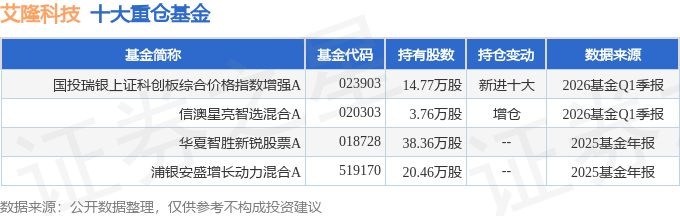 持有艾隆科技最多的基金为国投瑞银上证科创板综合价格指数增强A,目前规模为0.76亿元,最新净值1.5094(4月21日),较上一交易日下跌0.72%。该基金现任基金经理为殷瑞飞 钱瀚。