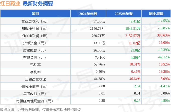 据证券之星公开数据整理,近期红日药业(300026)发布2025年年报。截至本报告期末,公司营业总收入49.41亿元,同比下降14.55%,归母净利润1849.51万元,同比下降13.85%。按单季度数据看,第四季度营业总收入7.93亿元,同比下降40.93%,第四季度归母净利润-6226.78万元,同比上升57.61%。本报告期红日药业盈利能力上升,毛利率同比增幅10.52%,净利率同比增幅13.36%。