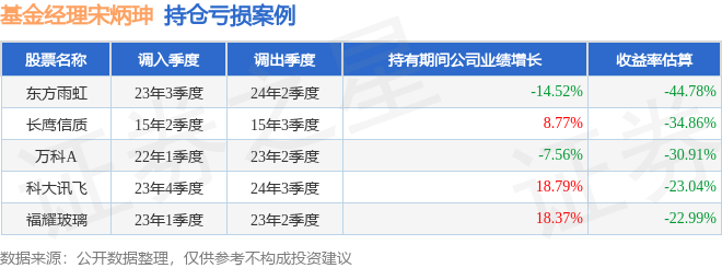 宋炳珅管理的工银研究精选股票基金在23年3季度买入东方雨虹,在持有3个季度后在24年2季度卖出。持有期间的估算收益率为-44.78%,持有期间东方雨虹在2023年到2024年的年报营业总收入降幅为14.52%。