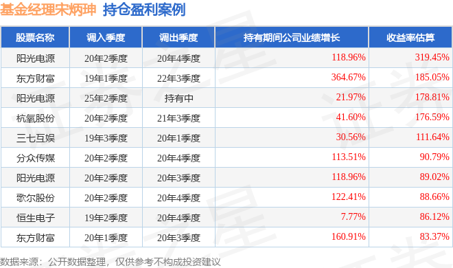 宋炳珅管理的工银研究精选股票基金在20年2季度买入阳光电源,在持有2个季度后在20年4季度卖出。持有期间的估算收益率为319.45%,持有期间阳光电源在2019年到2020年的年报归属净利润增幅达118.96%。