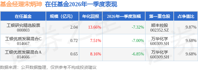 证券之星消息,截止2026年一季度末,基金经理宋炳珅旗下共管理3只基金,本季度表现最佳的为工银优质发展混合A(014666),季度净值跌6.85%。