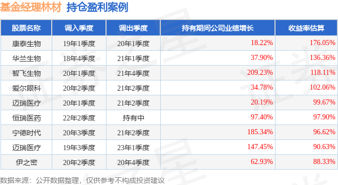 林材管理的前海联合国民健康混合A基金在19年1季度买入康泰生物,在持有1年又0个季度后在20年1季度卖出。持有期间的估算收益率为176.05%,持有期间康泰生物在2019年到2020年的年报归属净利润增幅达18.22%。