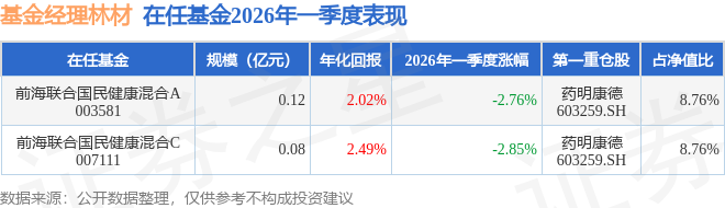 证券之星消息,截止2026年一季度末,基金经理林材旗下共管理2只基金,本季度表现最佳的为前海联合国民健康混合A(003581),季度净值跌2.76%。