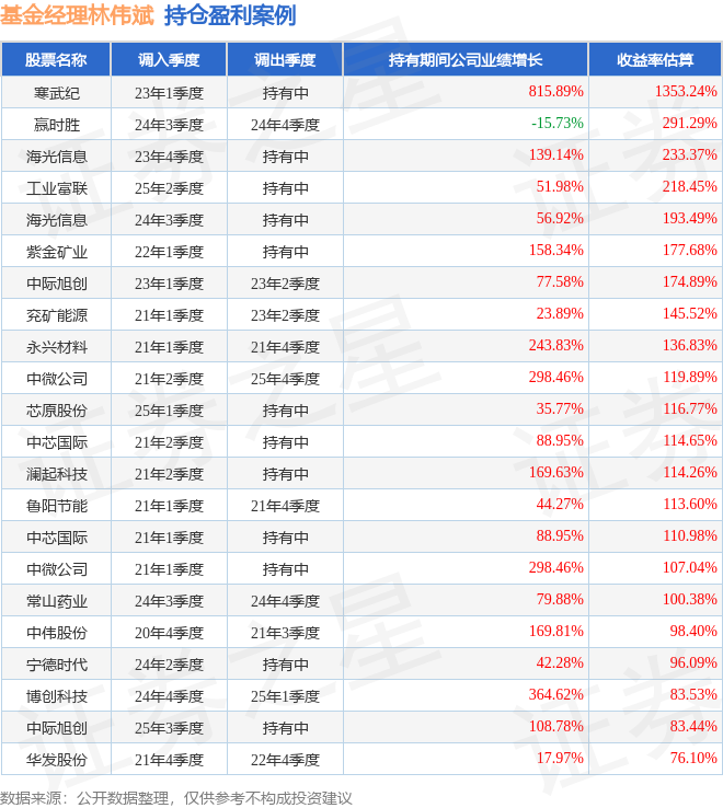 林伟斌管理的易方达中证红利ETF联接发起式A基金在20年4季度买入中伟股份,在持有3个季度后在21年3季度卖出。持有期间的估算收益率为98.4%,持有期间中伟股份在2020年到2021年的年报营业总收入增幅达169.81%。