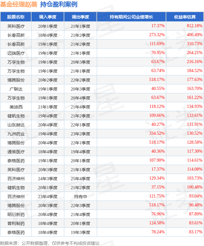 赵蓓管理的工银医疗保健股票基金在20年1季度买入英科医疗,在持有1年又0个季度后在21年1季度卖出。持有期间的估算收益率为812.18%,持有期间英科医疗在2020年到2021年的年报营业总收入增幅达17.37%。