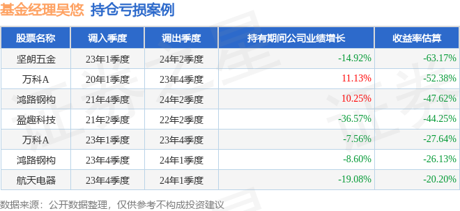 吴悠管理的嘉实产业优选LOF基金在23年1季度买入坚朗五金,在持有1年又1个季度后在24年2季度卖出。持有期间的估算收益率为-63.17%,持有期间坚朗五金在2023年到2024年的年报营业总收入降幅为14.92%。