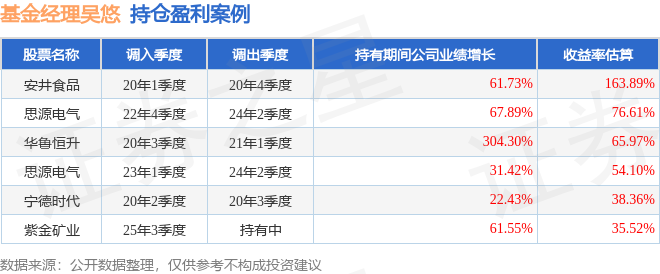 吴悠管理的嘉实丰和灵活配置混合A基金在20年1季度买入安井食品,在持有3个季度后在20年4季度卖出。持有期间的估算收益率为163.89%,持有期间安井食品在2019年到2020年的年报归属净利润增幅达61.73%。