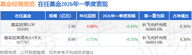 证券之星消息,截止2026年一季度末,基金经理吴悠旗下共管理2只基金,本季度表现最佳的为嘉实欣荣LOF(501091),季度净值跌0.43%。