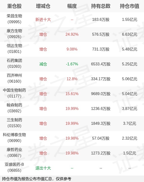 证券之星消息,4月22日工银瑞信基金旗下刘伟琳 焦文龙管理的工银瑞信国证港股通创新药交易型开放式指数基金公布一季报,近1年净值增长率47.19%。与上一季度相比,该基金前十大重仓股新增荣昌生物;并对康方生物增仓115.0万股,为该基金第一大重仓股;亚盛医药-B等退出前十大重仓股;详细数据如下: