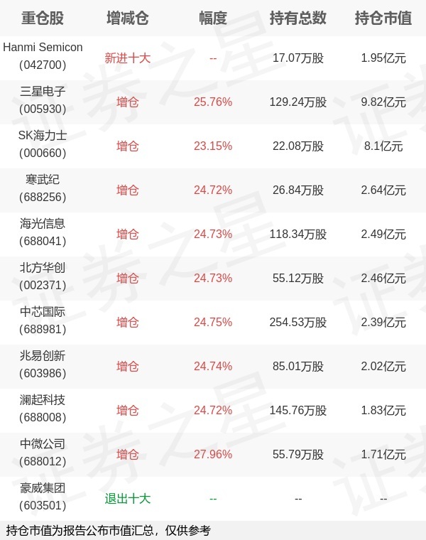 证券之星消息,4月22日华泰柏瑞基金旗下柳军 李沐阳管理的华泰柏瑞中证韩交所中韩半导体交易型开放式指数基金(QDII)公布一季报,近1年净值增长率143.54%。与上一季度相比,该基金前十大重仓股新增Hanmi Semicon;并对三星电子增仓26.47万股,为该基金第一大重仓股;豪威集团等退出前十大重仓股;详细数据如下: