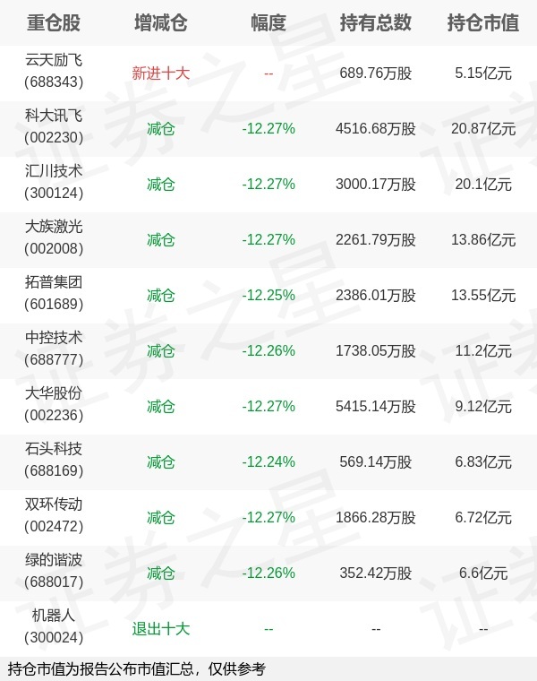 证券之星消息,4月22日华夏基金旗下华龙管理的华夏中证机器人交易型开放式指数基金公布一季报,近1年净值增长率23.85%。与上一季度相比,该基金前十大重仓股新增云天励飞;其中科大讯飞持仓占比9.96%,为该基金第一大重仓股;机器人等退出前十大重仓股;详细数据如下:
