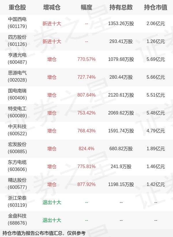 证券之星消息,4月22日国泰基金旗下吴中昊管理的国泰恒生A股电网设备交易型开放式指数基金公布一季报,近1年净值增长率134.39%。与上一季度相比,该基金前十大重仓股新增中国西电,四方股份;并对亨通光电增仓955.66万股,为该基金第一大重仓股;浙江荣泰,金盘科技等退出前十大重仓股;详细数据如下: