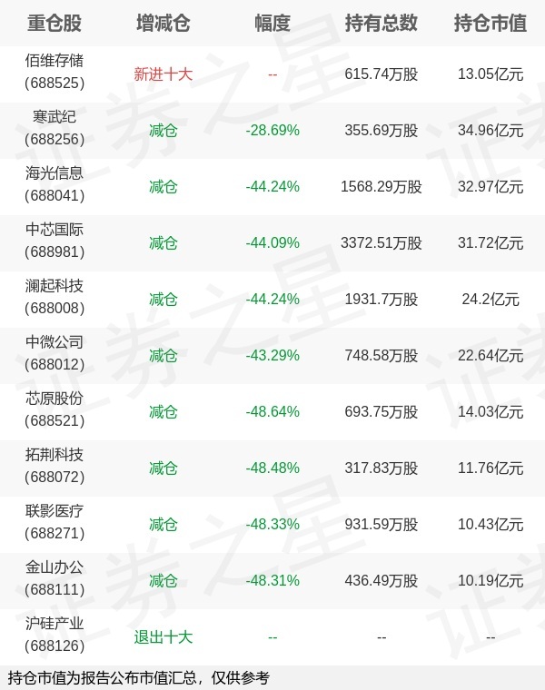 证券之星消息,4月22日易方达基金旗下林伟斌 成曦管理的易方达上证科创板50成份交易型开放式指数基金公布一季报,近1年净值增长率41.19%。与上一季度相比,该基金前十大重仓股新增佰维存储;其中寒武纪持仓占比9.37%,为该基金第一大重仓股;沪硅产业等退出前十大重仓股;详细数据如下: