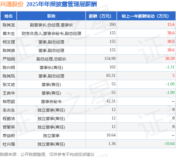 证券之星消息,兴通股份发布2025年年报,数据显示:公司主营收入16.28亿元,同比增7.51%。归母净利润为2.7亿元,同比减22.95%。扣非净利润为2.64亿元,同比减22.11%。当年公司员工总数822人,同比增12.45%。人均薪酬36.81万元(注:"人均薪酬"根据定期报告中"应付职工薪酬"附注的本期增加值 / 员工总数计算而来),同比减0.15%。人均创收198.1万元,同比减4.4%。人均创利33.45万元,同比减31.45%。其中管理层薪酬总额为1265.61万元,同比上一年增9.54%,薪酬最高的为副董事长,总经理,董事长陈其龙,薪酬260.0万元。