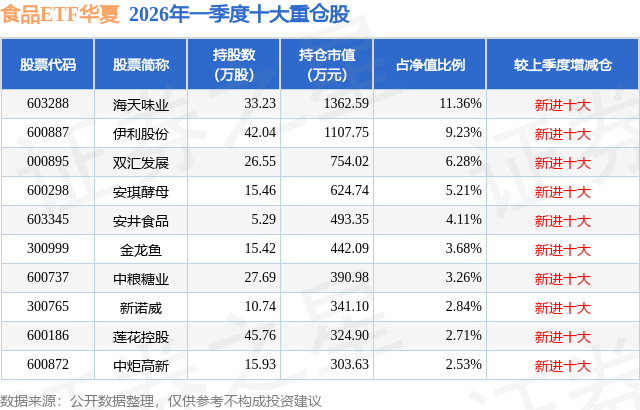食品ETF华夏基金成立于2025年12月31日,基金经理为王欣薇,基金跟踪标的为中证全指食品指数,成立以来超额回报为-1.95%,近一个月超额回报为0.05%。最新披露的基金持仓数据显示,截止2026年3月31日,该基金第一大重仓股为海天味业(603288),持股占比为11.36%。