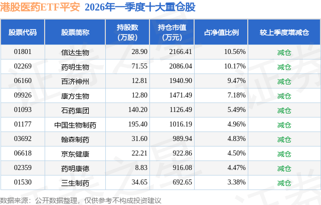 港股医药ETF平安基金成立于2021年12月16日,基金经理为翁欣,基金跟踪标的为中证港股通医药卫生综合港元指数,成立以来超额回报为-5.44%,近一个月超额回报为-0.34%。最新披露的基金持仓数据显示,截止2026年3月31日,该基金第一大重仓股为信达生物(01801),持股占比为10.56%。
