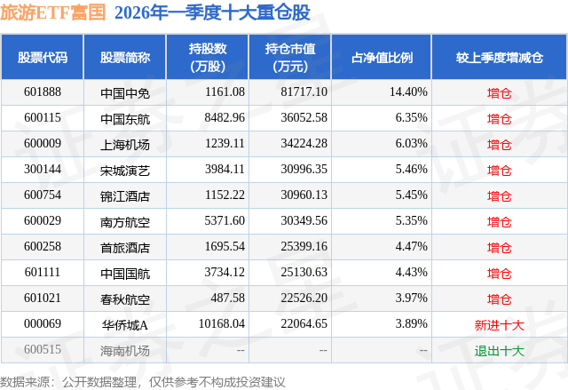 旅游ETF富国基金成立于2021年7月15日,基金经理为曹璐迪 殷钦怡,基金跟踪标的为中证旅游主题指数,成立以来超额回报为0.88%,近一个月超额回报为-0.02%。最新披露的基金持仓数据显示,截止2026年3月31日,该基金第一大重仓股为中国中免(601888),持股占比为14.4%。