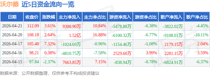 证券之星消息,截至2026年4月21日收盘,沃尔德(688028)报收于112.09元,上涨3.61%,换手率5.08%,成交量7.66万手,成交额8.58亿元。