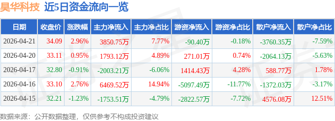 证券之星消息,截至2026年4月21日收盘,昊华科技(600378)报收于34.09元,上涨2.96%,换手率1.37%,成交量14.67万手,成交额4.96亿元。