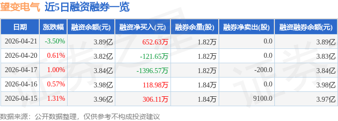望变电气融资融券信息显示,融资方面,当日融资买入2998.77万元,融资偿还2346.14万元,融资净买入652.63万元。融券方面,融券卖出0.0股,融券偿还0.0股,融券余量1.82万股,融券余额37.6万元。融资融券余额3.89亿元。