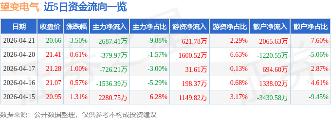 证券之星消息,截至2026年4月21日收盘,望变电气(603191)报收于20.66元,下跌3.5%,换手率3.97%,成交量13.09万手,成交额2.72亿元。