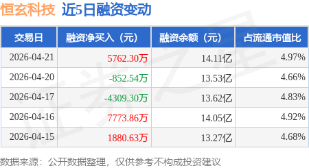 证券之星消息,4月21日,恒玄科技(688608)融资买入1.53亿元,融资偿还9544.95万元,融资净买入5762.3万元,融资余额14.11亿元,近20个交易日中有11个交易日出现融资净买入。