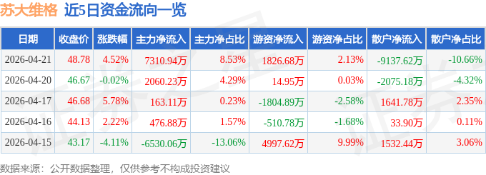 证券之星消息,截至2026年4月21日收盘,苏大维格(300331)报收于48.78元,上涨4.52%,换手率8.45%,成交量17.75万手,成交额8.57亿元。